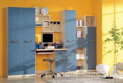 Zostava je bez stola a obdĺžnikovej police. Darujem k nej svetlomodrú komodu s tmavomodrými úchytmi a troma šuflíkami. Pozor, nábytky sú v čiastočnom, alebo úplnom demonte. Určite sa zíde šikovný majster pri skladaní.