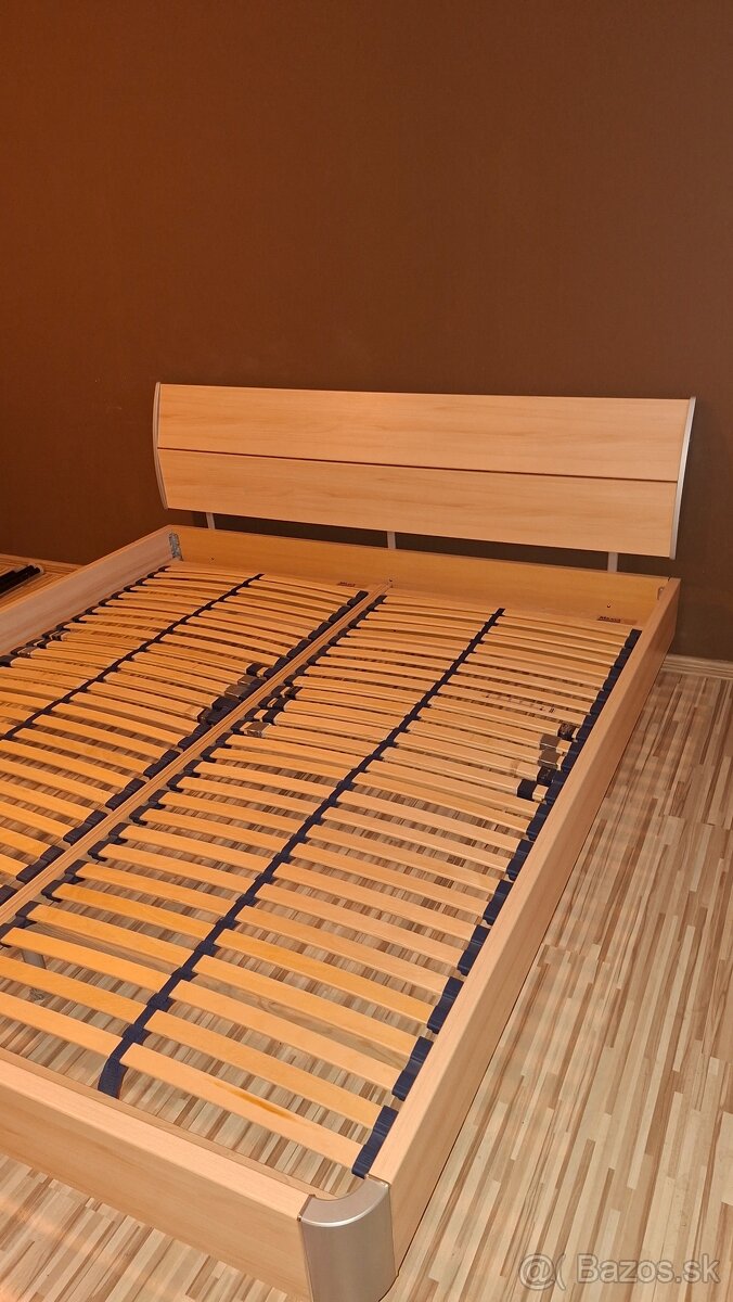 Predám zachovalú manželskú posteľ- rám, potrebné vymeniť rošty a doplniť matrace. Rozmery sú 190x210 cm.