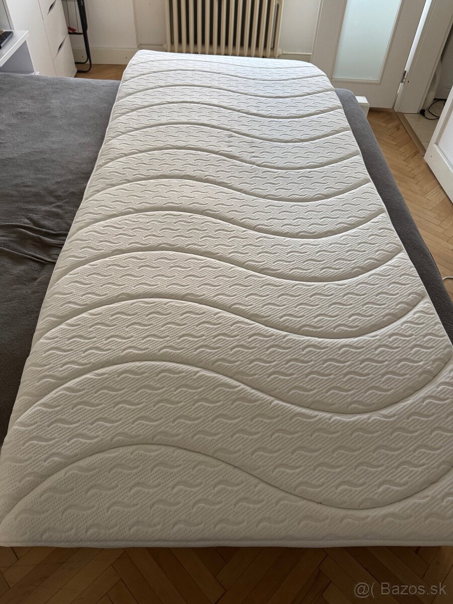Posteľ s matracom a topperom SLEEP - [31.1. 2026]Predám čalúnenú posteľ s matracom, rozmer 160 x 200 cm, zvýšená ložná plocha, topper (vrchný extra matrac), na nožičkách. Rám postele je z dreveného materiálu, potiahnutý tkaninou tmavosivej farby. Posteľ je bez úložného priestoru.