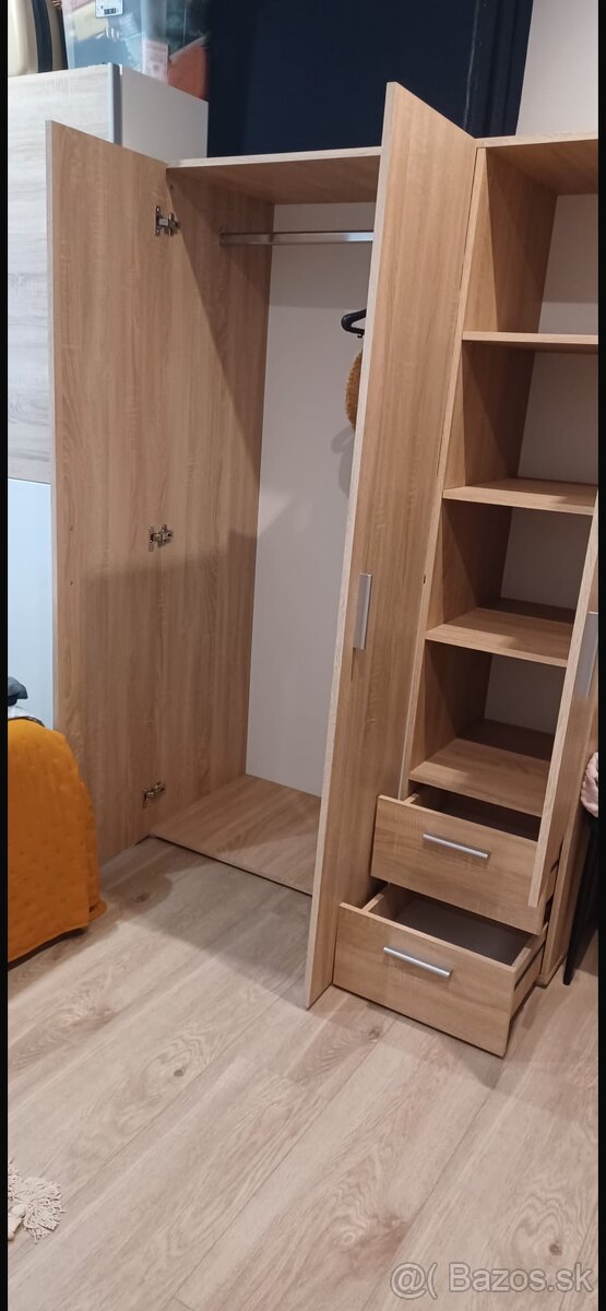 Skrina-dub sonoma, výška-176cm, šírka-120cm, priestor na vešanie- 77 cm, priestor s 3 poličkami-37cm, 2ךuplík, cena 100 EUR