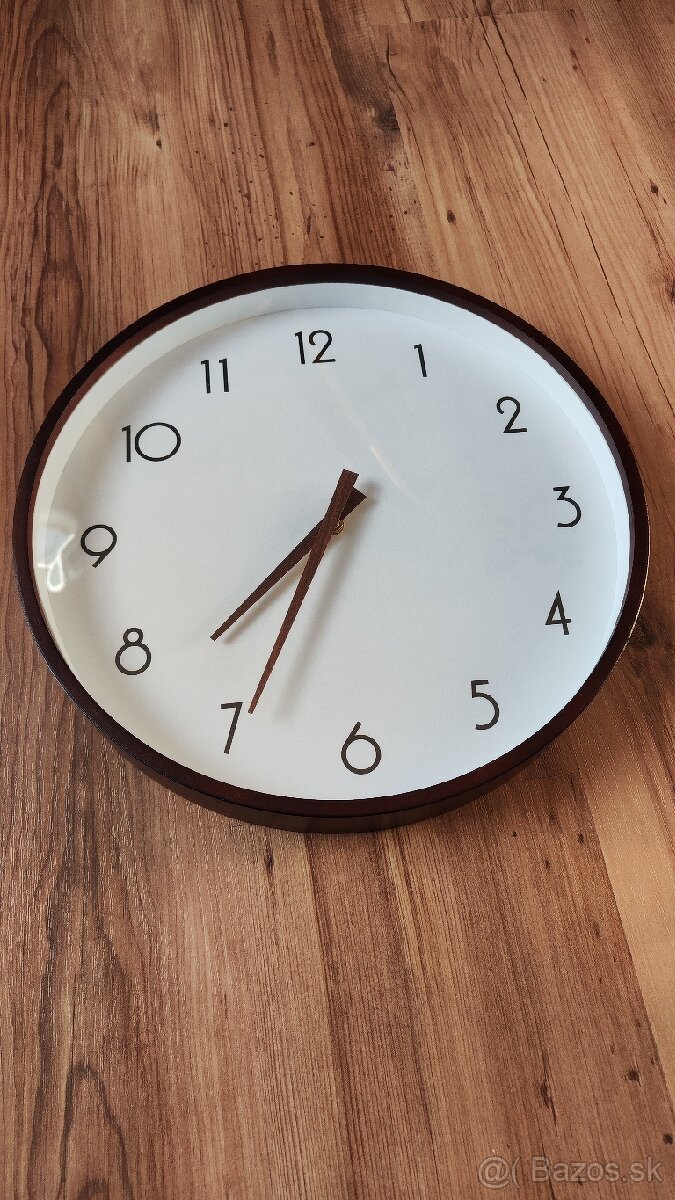 Predám nástenné hodiny na stenu. Materiál drevo v tmavohnedej farbe (odtieň orech). Priemer 35 cm. Napájanie 1x AA batéria.