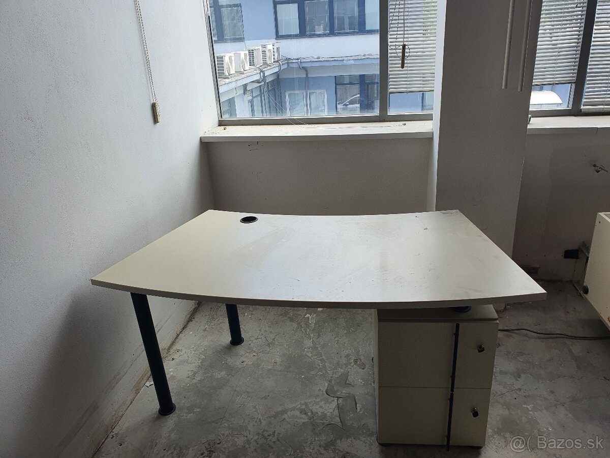 Predam velky mierne oblukovy pisaci stol. ERozmery: Sirka 170 cm, hlbka 80 cm, vyska 74 cm. Mam dve verzie, jednu bez zasuviek iba na kovovych nohach a druhy typ so zasuvkovym kontajnerom. Spolu mam 24 kusov. Cenba je za jeden kus. Stoly je mozne spajat do mierneho obluka, alebo oproti sebe a dat medzi ne zastenu, ako na poslednej fotke