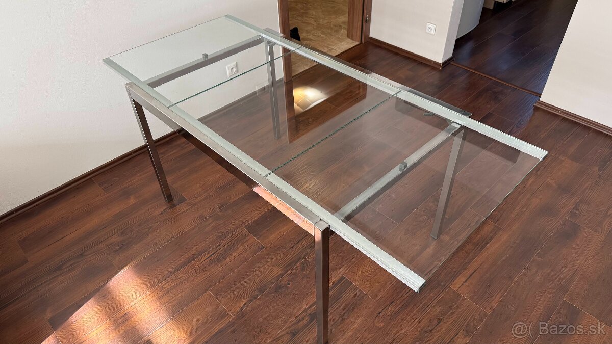 Jedálenský stôl - [25.2. 2026]Predám jedálenský rozkladací stôl, rozmer šírka 90cm, dĺžka 160cm, výška 75cm. Po rozložení 200,5cm. Vrchná doska sklenená, lesklá, čierna. Nohy kovové, biele, matné. Používaný, vykazuje drobné známky poškodenia. Jemné škrabance. Len osobný odber Poruba.