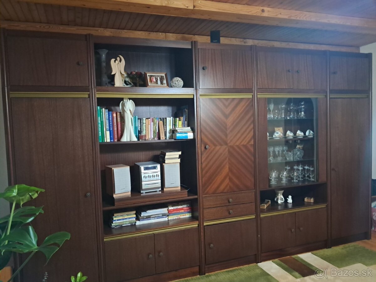 Obývacia stena "Dária"1973 - [28.2. 2026]Predám retro obývaciu stenu "Dária" mahagón, vysoký lesk z roku 1973 . Je používaná až do dnes, mierne opotrebovaná (pánty) niekde sú stopy po vode. Cena 50€ , Dohoda o cene je možná.