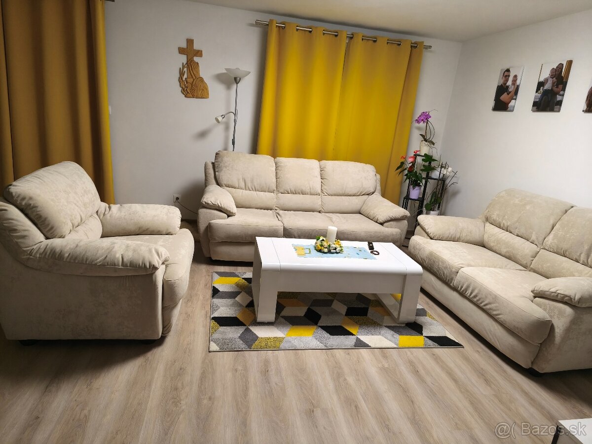 Dobrý deň, ponúkam na predaj novú sedaciu súpravu béžovej farby, veľmi príjemný a ľahko čistiteľný materiál. Sedačka je naozaj pohodlná, nie je roztahovateľná.