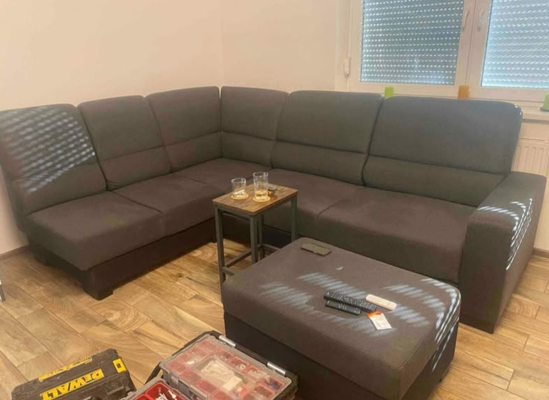 Sedacia suprava s taburetom(vyrobena na mieru) je ako nova, necely rok sa vyuzivala,da sa rozlozit na spanie,ma ulozny priestor