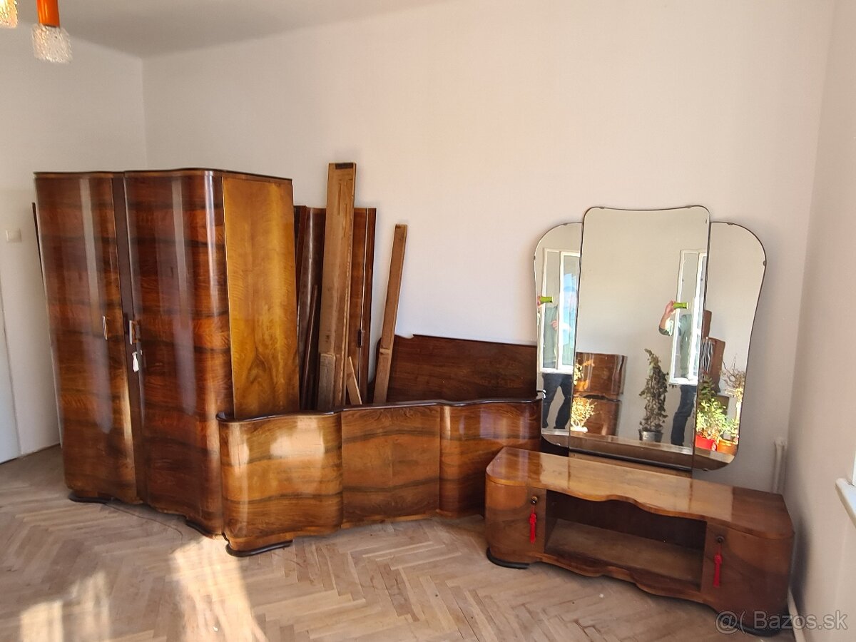 Ponúkam na predaj spálňovú a jedálenskú zostavu zo 50-tych rokov v zachovalom stave. Spálňa: posteľ 165cm (kompletne rozložená), 2x nočný stolík, toaletný stolík so zrkadlom 130cm, dvojdverová šatníková skriňa 120cm, trojdverová šatníková skriňa 180cm(kompletne rozložená)Jedáleň: Sekretár 225cm, jedálenský stôl, 4ks stoličiek, malý konzolový stolík. Cena spolu 450€. DS a okolie. Možnosť predaja jedálne a spálne jednotlivo, ale nie po kusoch.