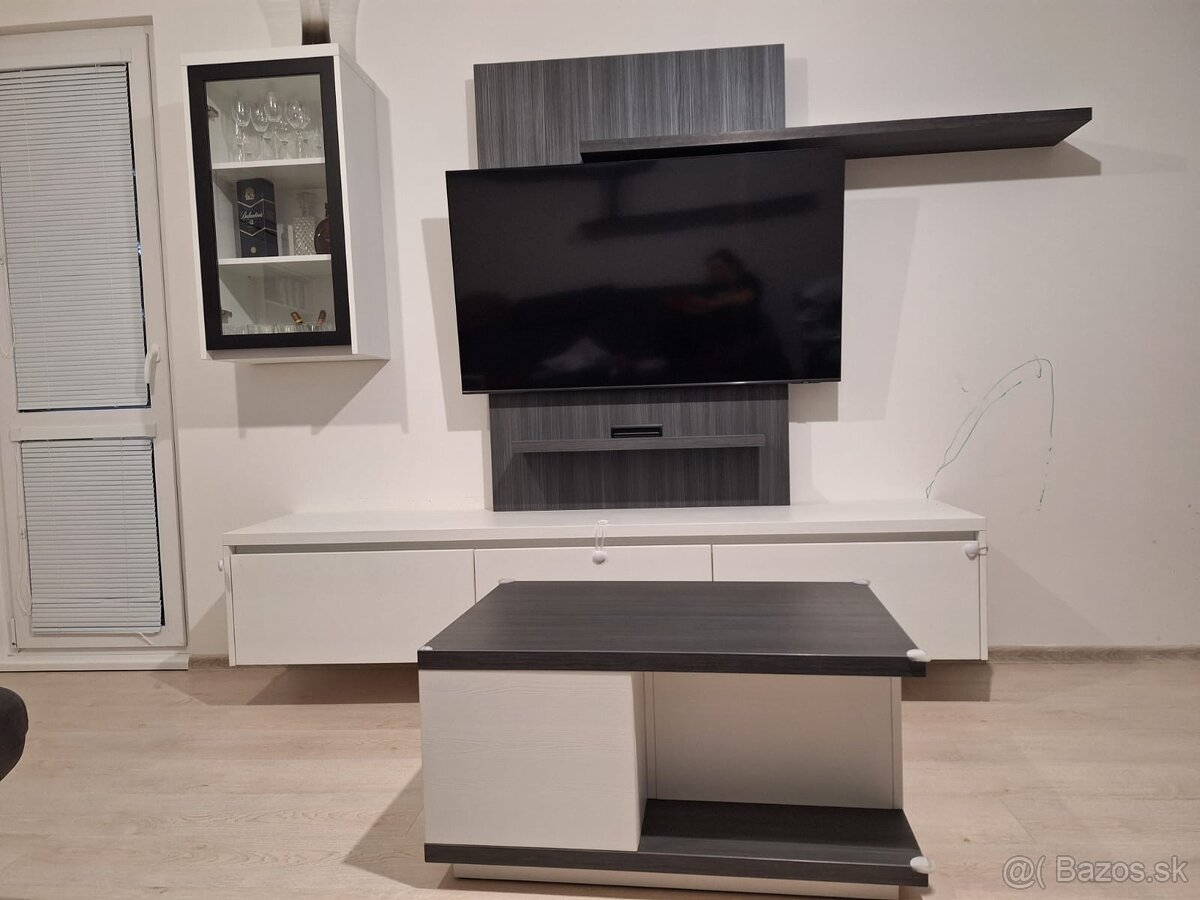 Univerzalna obývacia zostava na stenu + masivny stôl na kolieskách, vyrobené stolárom na mieru do bytu.