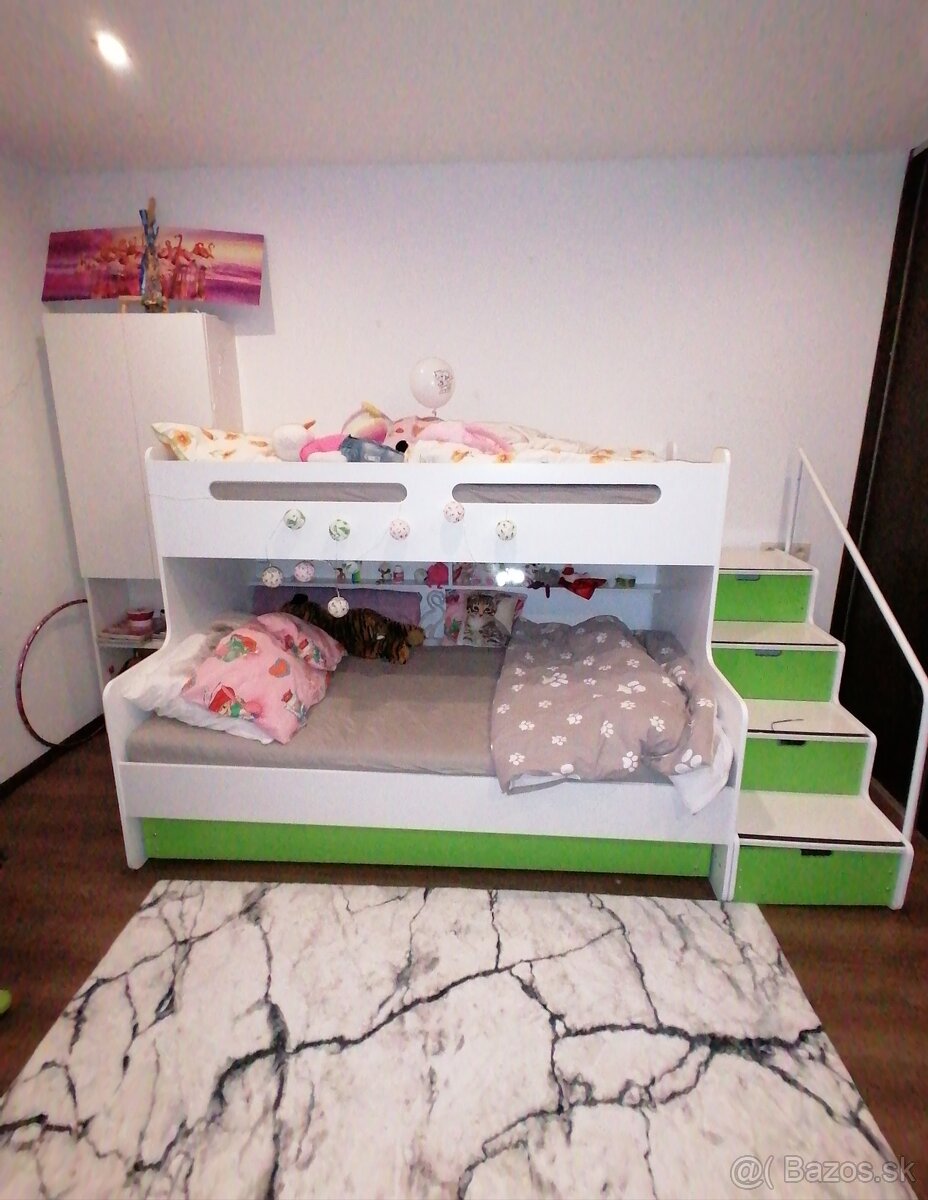 Predám poschodovú posteľ s úložným priestorom pod posteľou a v šuflíkoch ktoré sú na schodoch. Posteľ predávam z hygienických dôvodov bez matracov. Rozmery spodná časť 120x200 vrchná časť 80x200