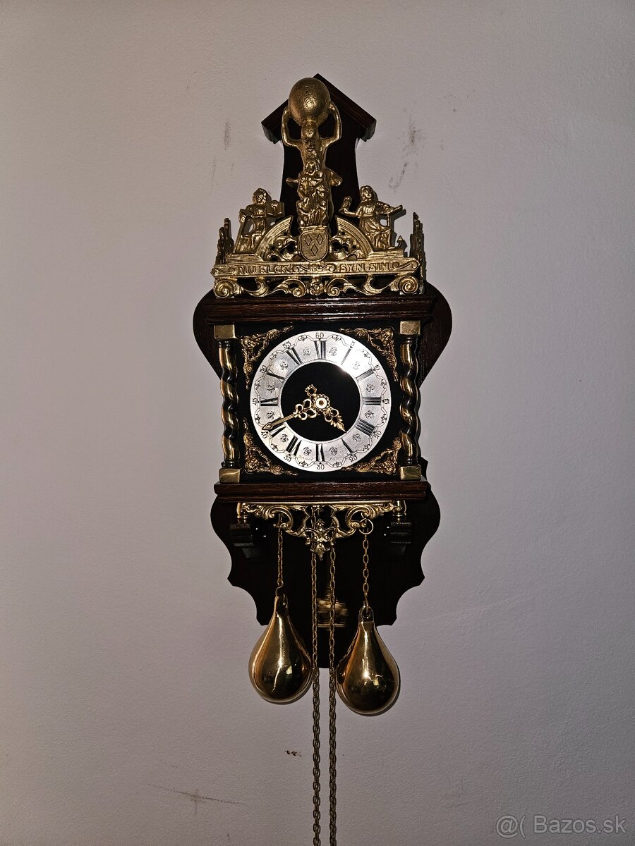 Predam reprezentatívne nástenné hodiny z oblasti Zaan (Holandsko), typické bohatým zdobením a precíznym remeselným spracovaním. Hodiny sú osadené dvojzávažovým mechanickým strojčekom, ktorý zaisťuje presný chod a tradičný spôsob odbíjania v pol a v celú hodinu do zvončeka.