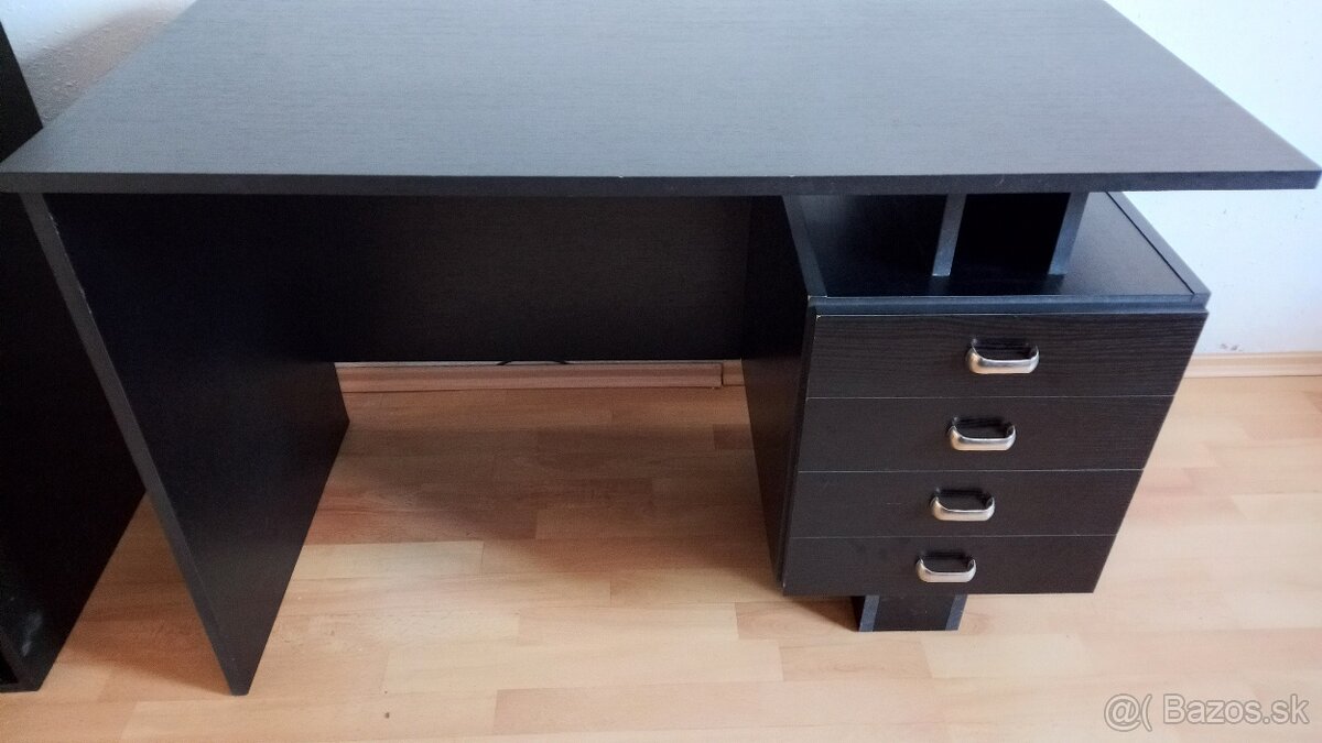 Predám kancelársky stôl, drevotrieska, čierna dýha, 4 zásuvky a 3 menšie odkladacie priehradky, šírka 110 cm, hĺbka 58 cm, výška 74 cm.