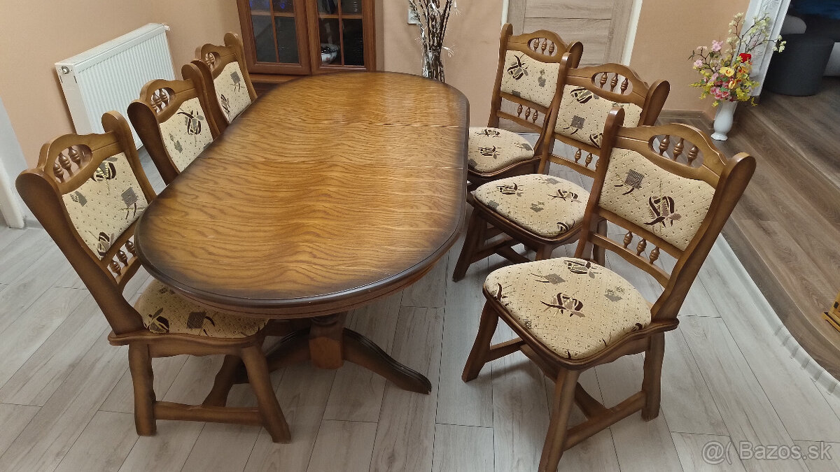 Predám jedálenský stôl a stoličky. Rozmery 154 cm, + 1 diel 193 cm, +2 diely 231. Material - Drevo