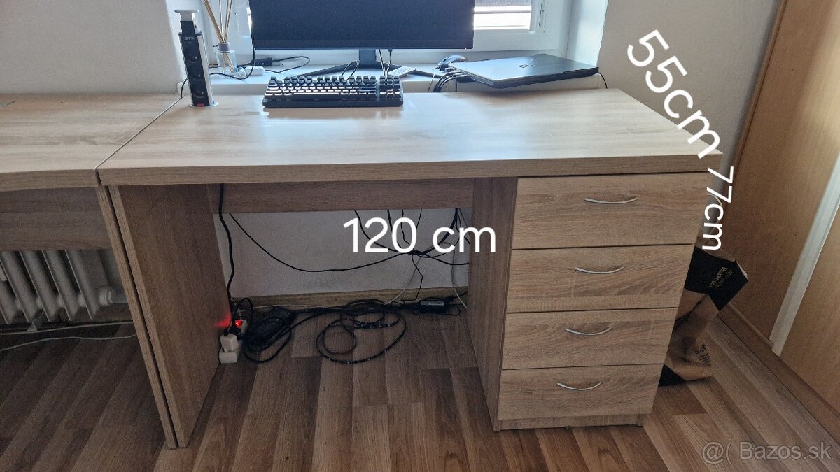 Predám písací rohový stôl zložený z dvoch častí stôl- box 4 x šuflik .A rohový stôl box 4xšuflik na kolečkách. Robený na mieru. Hrubka vrchnej dosky 3,5cm. Komplet alebo jednotlivo.