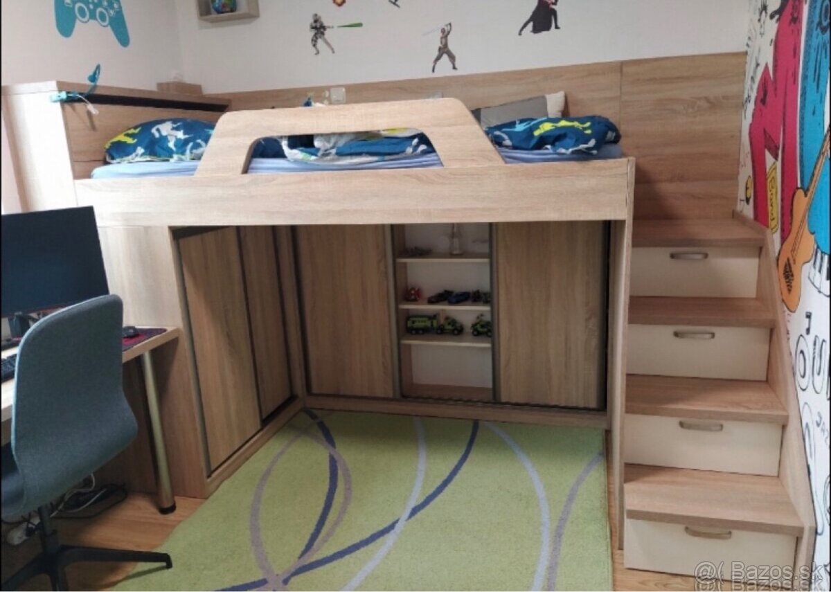 Predám vyvýšenú posteľ a úložným priestorom pod posteľou a v schodoch, a hracím miestom.
