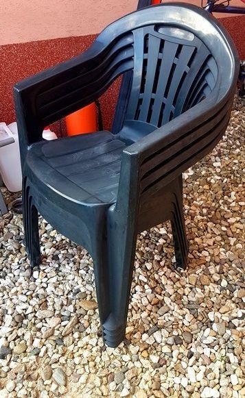 Záhradné stohovateľné kreslá tmavozelenej farby 4ks po 6 eur.
