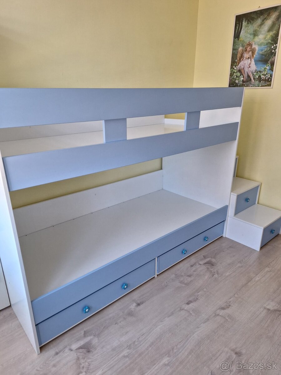 Predám poschodovú posteľ s dvoma perináčmi a schodmi s bohatým úložným priestorom v top stave. Posteľ je v kombinácii farieb svetlomodrá s bielou vhodná pre chlapcov aj dievčatá.