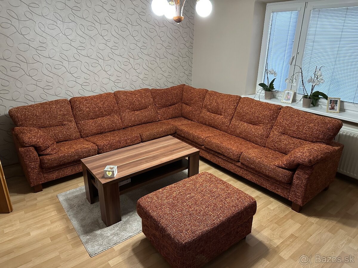 Predám zachovalu rohovu sedačku rozmer 300x300cm, celková výška 90cm, rozmer taburetky 90x70cm.....po celé roky používaná s natiahnutými dekami na sedenie...na niektorých miestach trochu vrzga. Dohoda možná