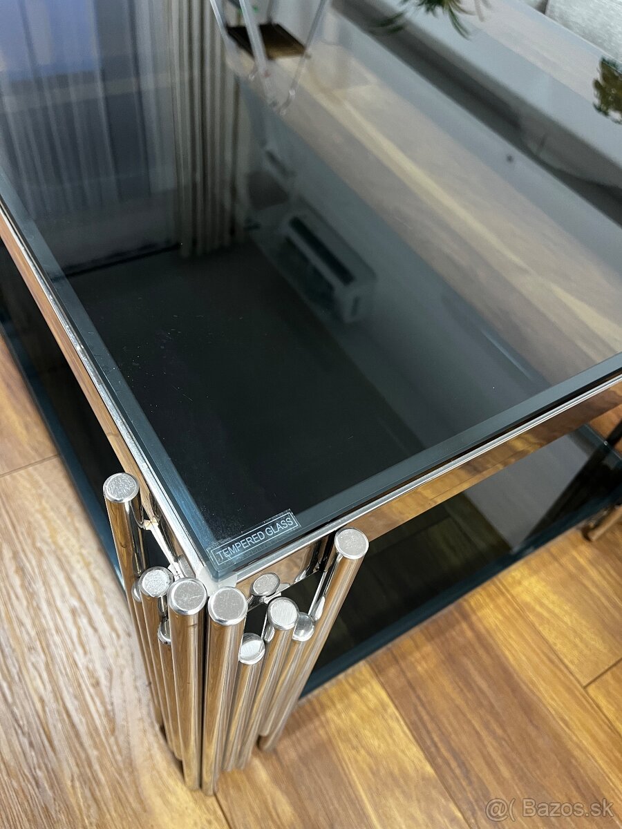 Predam chromovany konferencny stolik cierne bezpecnostne kalene sklo (5-krát pevnejšie ako bežné sklo rovnakej hrúbky. Ak dôjde k jeho rozbitiu, netvoria sa ostré črepy, ale sklo sa roztriešti na drobné, tupé úlomky, ktoré minimalizujú riziko vážneho zranenia. Vďaka tvrdenému povrchu lepšie odoláva bežnému opotrebovaniu a škrabancom.)