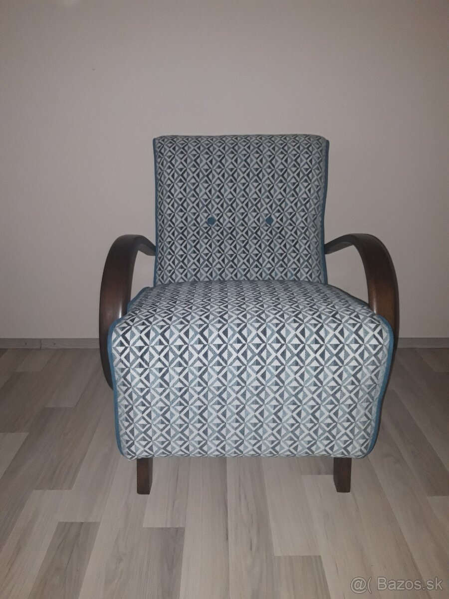 Retro kreslo - [24.2. 2026]Krásne kreslo kompletne zrekonštruované,očalúnené kvalitnou pevnou látkou. Drevené časti ošetrené olejom a matným lakom. Kreslo je mierne naklonené čo mu s kombináciou s madlami dáva atypický tvar.