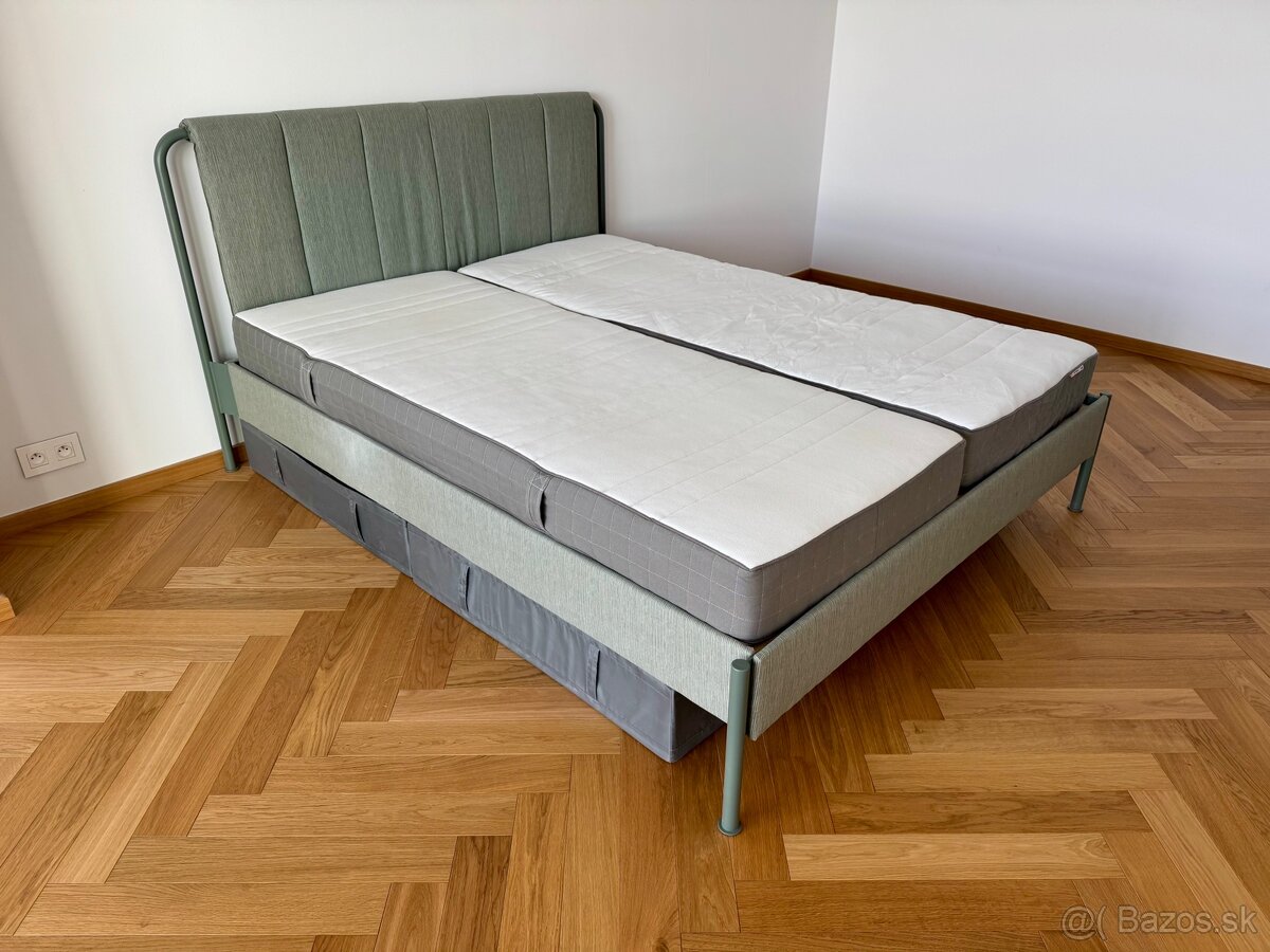 Predám málo požívanú sivozelenú manželskú postel 160x200 cm Tällåsen z Ikea. Súčasťou postele je pevný rošt, 2 tvrdé latexové matrace Morgedal vysoké 18 cm. Pod postelou 6 úložných sivých látkových boxov.