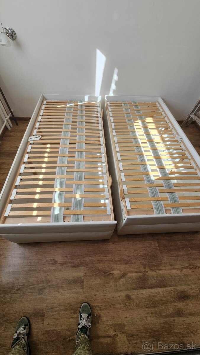 Predám čalúnenú manželskú posteľ s dvoma lamelovými roštami. Rozmer 180x200 cm. Posteľ je pevná, plne funkčná a má veľký úložný priestor. Predáva sa bez matracov.