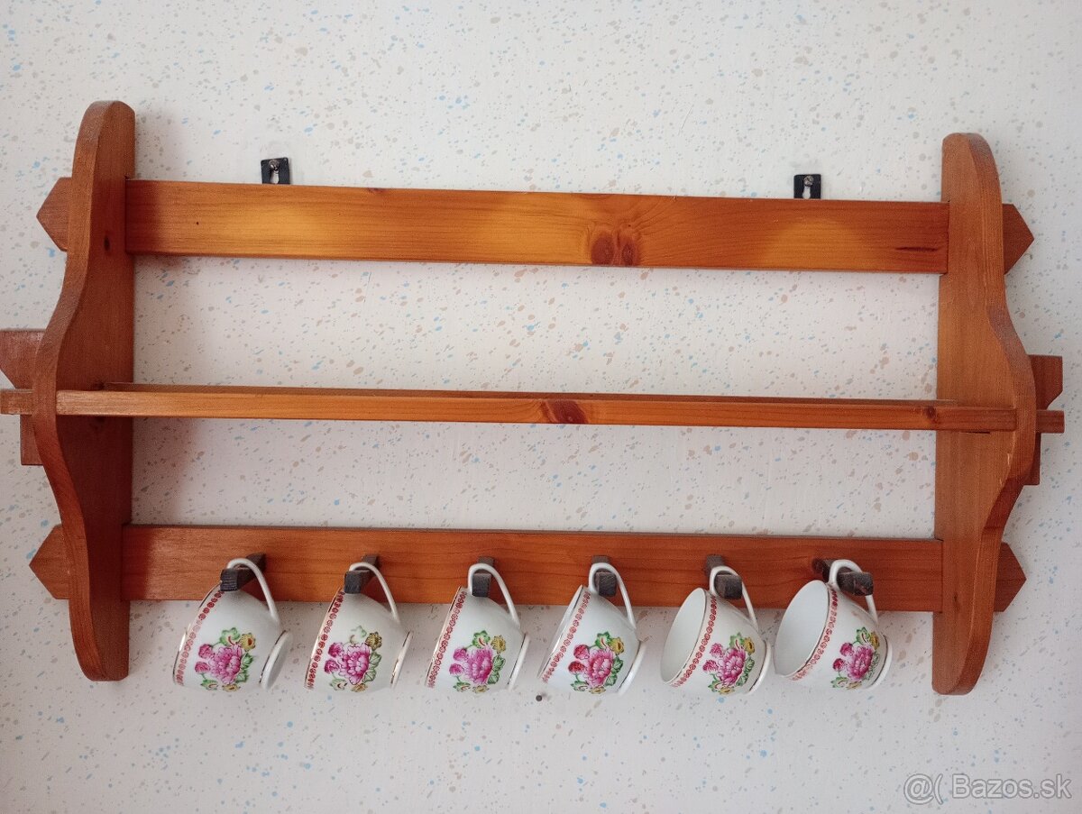 Predám drevenú poličku širokú cca 72 cm. Pridám k nej grátis šáločky na fotke aj ručne vyšívanú dečku. Šálky sú 2. trieda ale ako dekorácia na poličku slúžia veľmi dobre lebo tam presne pasujú zavesiť za uško.