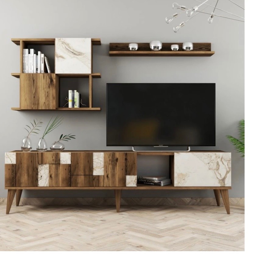 Celá zostava je vyrobená z kvalitného materiálu v dekore dreva orech doplnená o prvky bieleho mramoru.