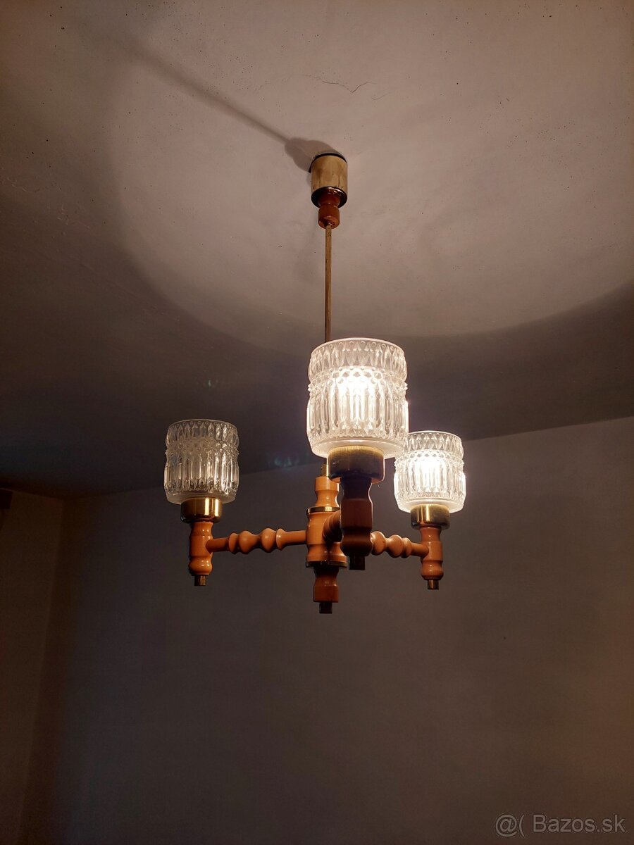 Predám retro drevený trojramenný luster s kovovým držiakom na 3 žiarovky s päticou E27. Možno nahradiť aj LED žiarovkami. Vhodný do bytu, na chalupu, chatu a pod.