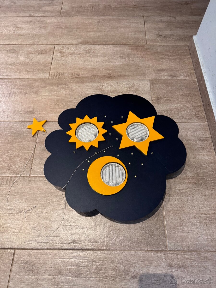 Detské stropné svietidlo v tvare nočnej oblohy s dvoma typmi osvetlenia je vhodné do detských izieb. Obsahuje 3× plochú žiarivku GX53 o maximálnom príkone á 9 W a 16 LED diód, ktoré vytvárajú „hviezdne nebo“. Led diódy sa zapínajú šnúrkovým vypínačom – hviezdou. Led diódy majú spotrebu iba 1W, môžete ich teda nechať bez obáv svietiť