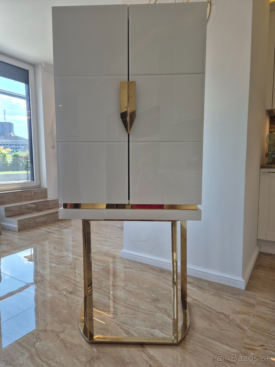 Z dôvodu sťahovania predávam luxusnú dvojdverovú barovú skrinku talianskej značky Vical v štýle art deco. Vonkajšie prevedenie je bielej farby vo vysokom lesku (zvonku drevo pokryté sklom) s lesklými kovovými prvkami zlatej farby. Vnútorná časť je so zadným zrkadlom a predelím s 1 policou.