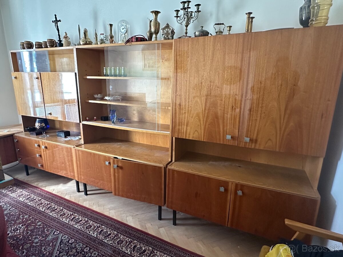 Predám zachovalú obývaciu stenu z masívnej dyhovanej drevotriesky v retro štýle (cca 60.–70. roky). Nábytok pozostáva z viacerých samostatných dielov – skrinky, presklená vitrína a úložné priestory.