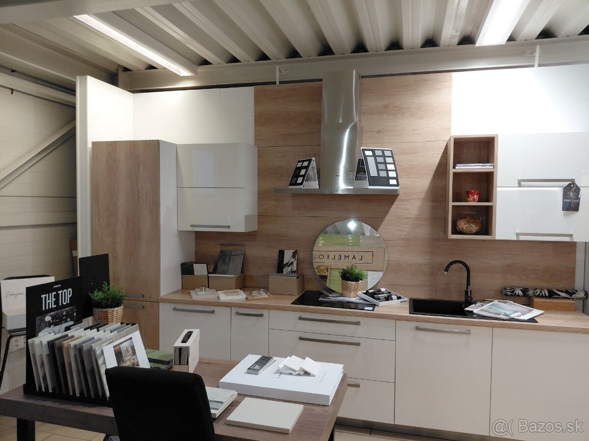 Predám novú, výstavnú kuchyňu vo výnimočnej kombinácií bieleho vysokého lesku a drevodekoru (dub) – elegantná a nadčasová.