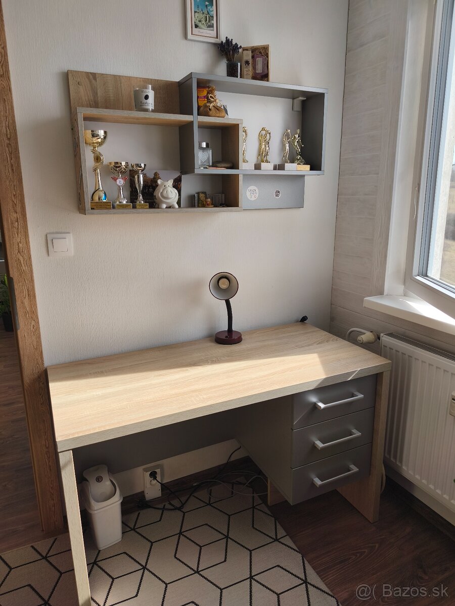Predám písací stolík spolu s poličkou a lampou. Rozmer 125cmx60cm Prevedenie-dub sonoma a sivá. Cena 80€(dohoda)