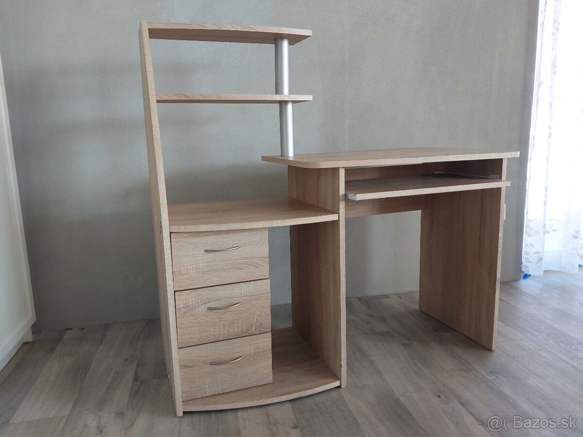 Praktický PC stolík. Dekor dub. Stôl má moderný, asymetrický vzhľad s integrovaným policovým regálom na ľavej strane. Obsahuje tri praktické zásuvky, otvorený priestor vhodný napríklad pre počítačovú skriňu a dve nadstavbové police na odkladanie dokumentov či dekorácií. Hlavná doska má zaoblené rohy a je doplnená o výsuvný panel na klávesnicu, čo šetrí miesto na pracovnom stole.Vyrobený je z laminovaného dreveného materiálu, ktorý sa ľahko udržiava. Cena 15 eur. Možnosť dopravy Senica a okolie.