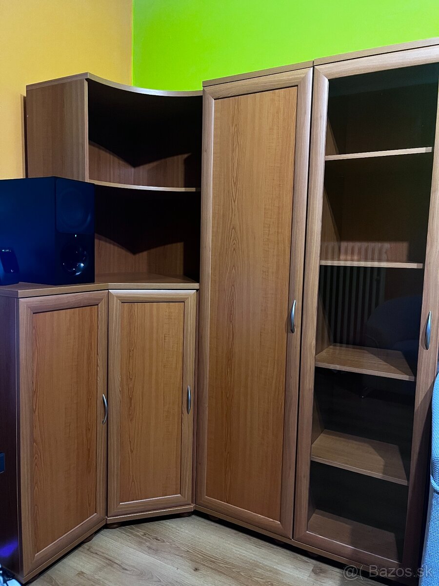 Na predaj stena pozostávajúca z malej skrinky, rohovej skrinky s nadstavcom, skrinky s policami a vitríny. Pozrite si aj moje ďalšie inzeráty.