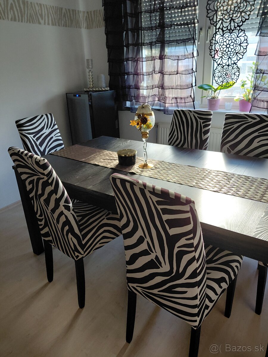 Predám krásne málo používané jedálenské stoličky zebroveho vzoru.osobny odber a predaj len spolu 6 kusov.Cena 50€ za kus spolu 300€.