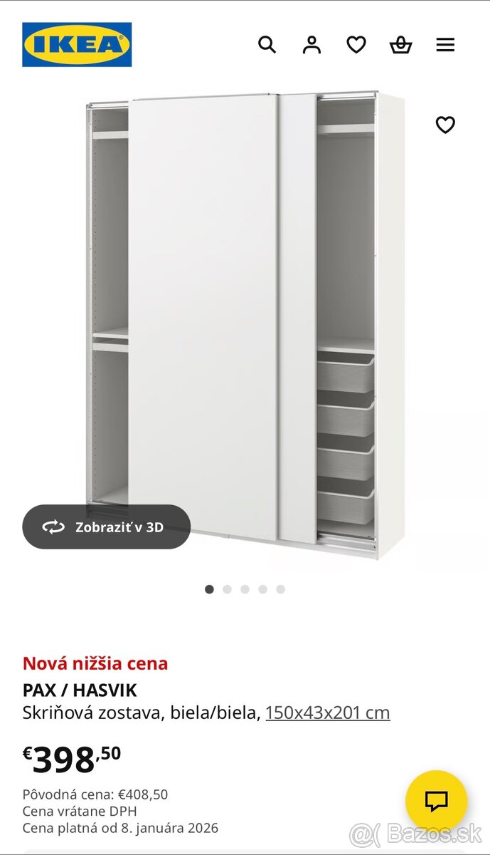 Skriňa používaná 1 rok. Vnútorne vybavenie ako na foto. Osobný odber Nové Mesto nad Vahom. PC skoro 400€, predám za polovicu vzhľadom k tomu, že sa sťahujeme a nabytok je nadbytočný. K skrini sa dá v Ikei dokúpiť príslušenstvo podľa vlastného uváženia.