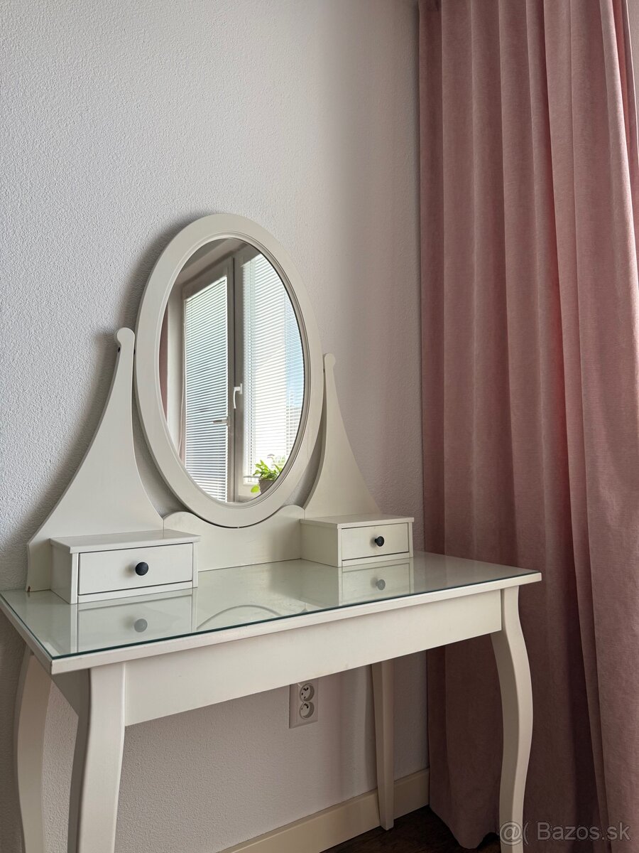 Predám elegantný biely kozmetický (toaletný) stolík so zrkadlom. Stolík má krásny jednoduchý dizajn a sklenenú vrchnú dosku, ktorá sa ľahko čistí. Zrkadlo je pevne pripevnené a ideálne na líčenie alebo úpravu vlasov.