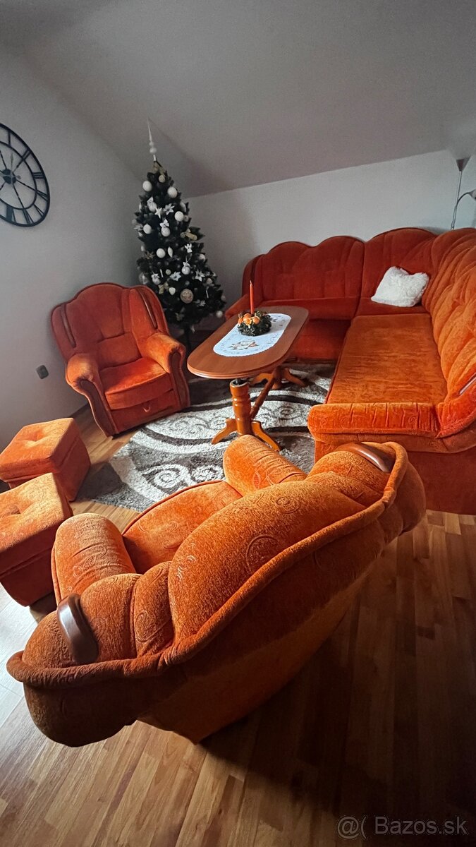 Predávame málo opotrebovaný gauč s taburetkami a fotelkami poškodenie nieje žiadne,kopec úložného priestoru +gauč sa dá rozložiť na posteľ z úložným priestorom ktomu sa predáva aj stolík gauč komplet 180€. A stolík rozkladatelni,drevený,dá sa aj rozložiť a zdvihnúť za 30€