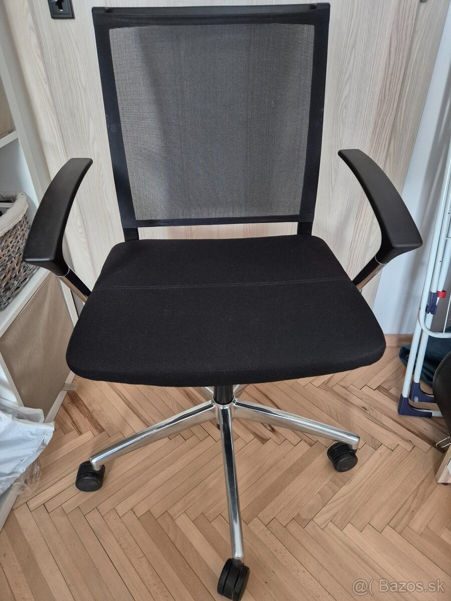 Je pohodlná a nevysedená/nezničená. Dá sa výškovo nastaviť a je otočná. Má kovové lakťové opierky a kolieskovú platformu. Je stabilná a pevná - vhodná na home-office. Vyrobená v Nemecku - vidno aj na štítku.