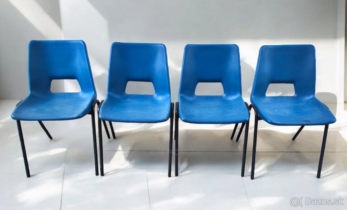 Predám modré konferenčné, kancelárske plastové stoličky, 4 rôzne druhy, sú stabilné, stohovateľné, viac kusov z každého druhu, cena 12€ za kus.