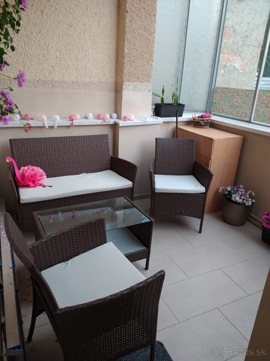 Praktické riešenie na malý balkón: D111cm Š56cm V73cm . Sedenie je rok staré, no použité len párkrát. Nachádza sa na krytom balkóne, vždy chránené obrusom a okennou clonou pred slnkom, takže je v top stave ako nové.