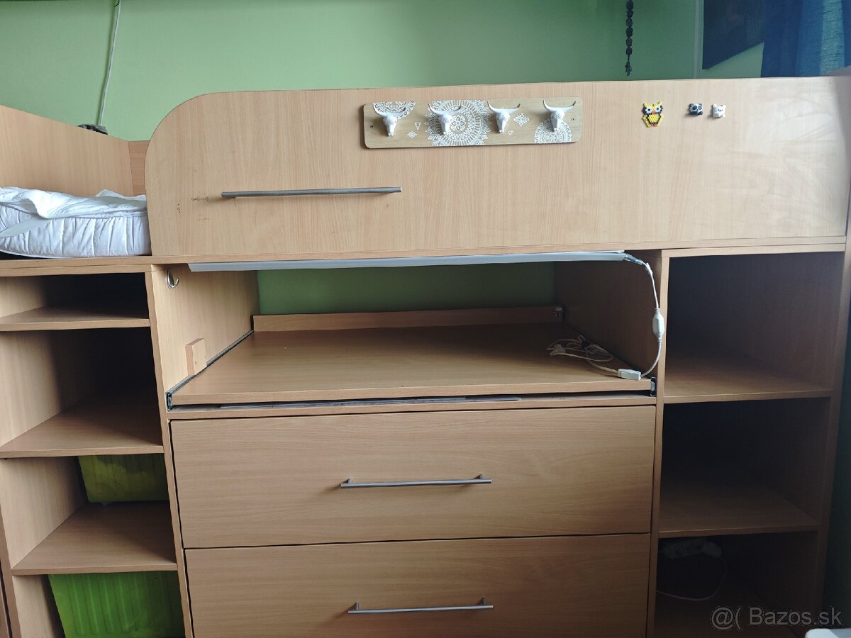 Predám vyvýšenú posteľ dp detskej izby. Má veľký výsuvný stôl z ktorého netreba odpratávať bordel, ale staci iba zasunúť. Posteľ má aj dva obrovské šufliky. Je na štandardný matrac 90x200. Postele mám 2ks jedna je ľavá a druhá pravá. Ideálne je zobrat obidve