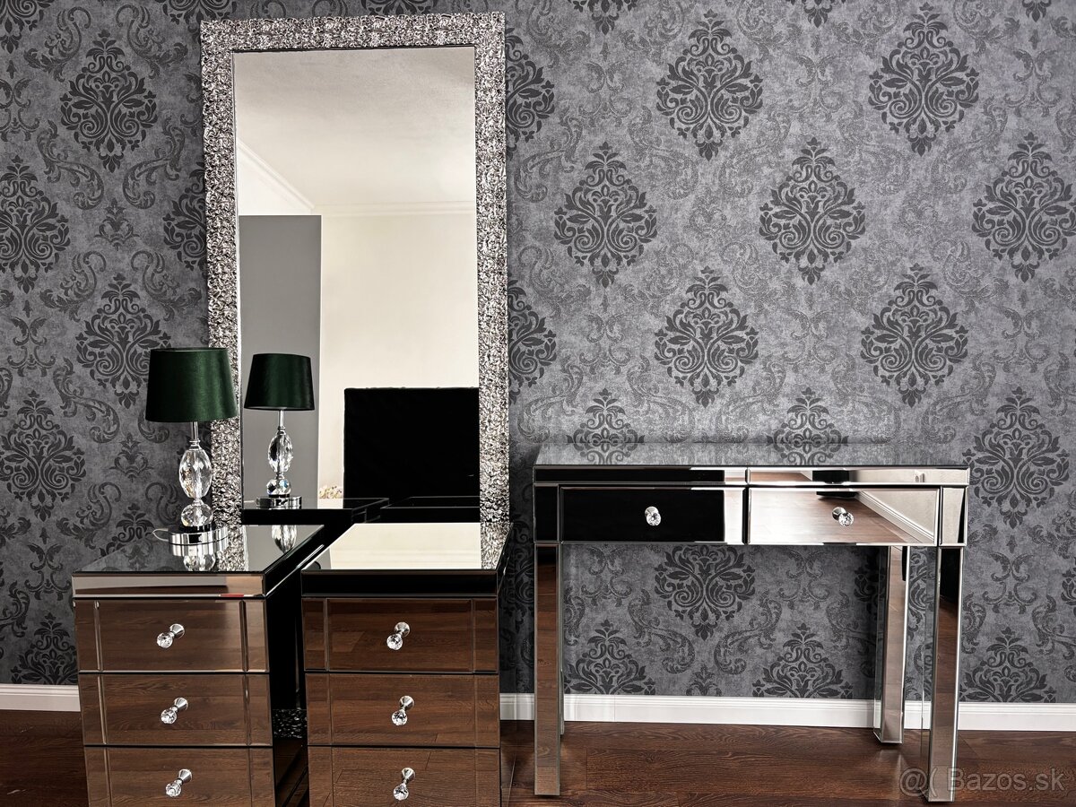 Predam luxusny zrkadlovy nabytok v style glamour. Nabytok je v stave noveho, bez akehokolvek poskodenia. Ide o dva nocne stoliky, toaletny (kozmeticky) stolik, zrkadlo. Vsetky tri stoliky predavam jedine ako komplet. Uvedena cena je bez zrkadla. Zrkadlo je na dohode.