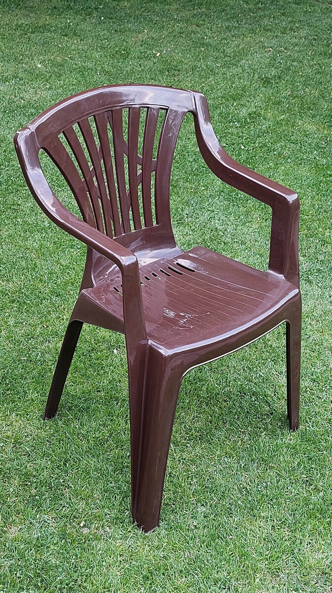 Predám súpravu 6 ks extra pevná, pohodlná plastová/záhradná/terasová stolička, stohovateľná, tmavohnedá farba, darujem záhradný úkryt na kľúče, na SMS neodpovedám, dovoz možný ZA,PB