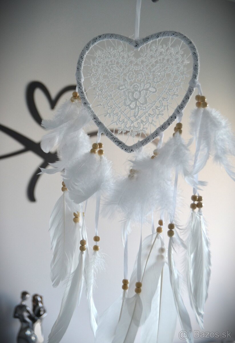 Dekoratívny lapač snov v tvare srdca s výpletom z bielej čipky. Lapač je ozdobený korálkami a pravými perami v bielej farbe. Celková dĺžka 60 cm.