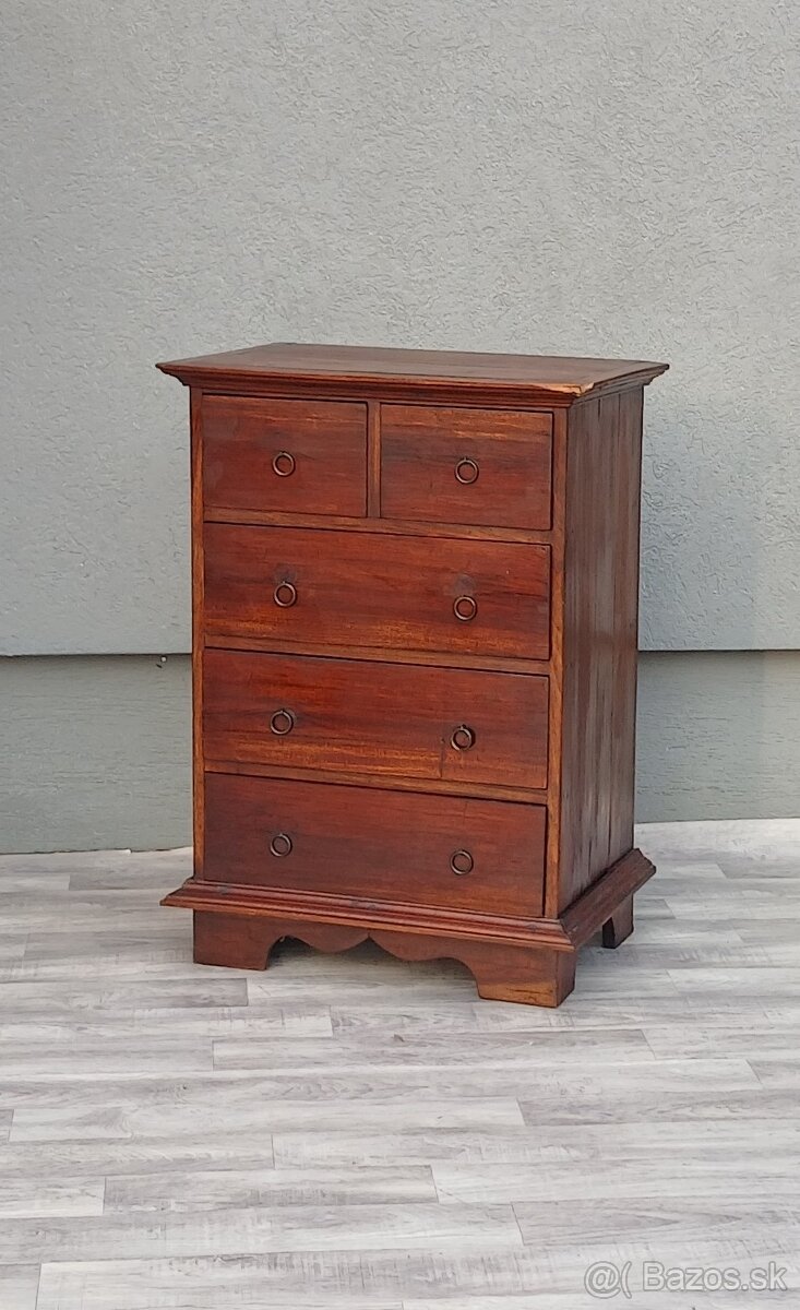Komôdka v koloniálnom štýle je vyrobená z teakového masívu . Ponúka praktický úložný priestor v podobe piatich zásuviek. Dve menšie sú umiestnené vedľa seba vo vrchnej časti, pod nimi nasledujú tri široké zásuvky. Okrúhle kovové „gombíky“ ladia s rustikálnym vzhľadom. Spodná časť je zdobená vyrezávanou vlnovitou lištou, ktorá zjemňuje celkový masívny vzhľad.