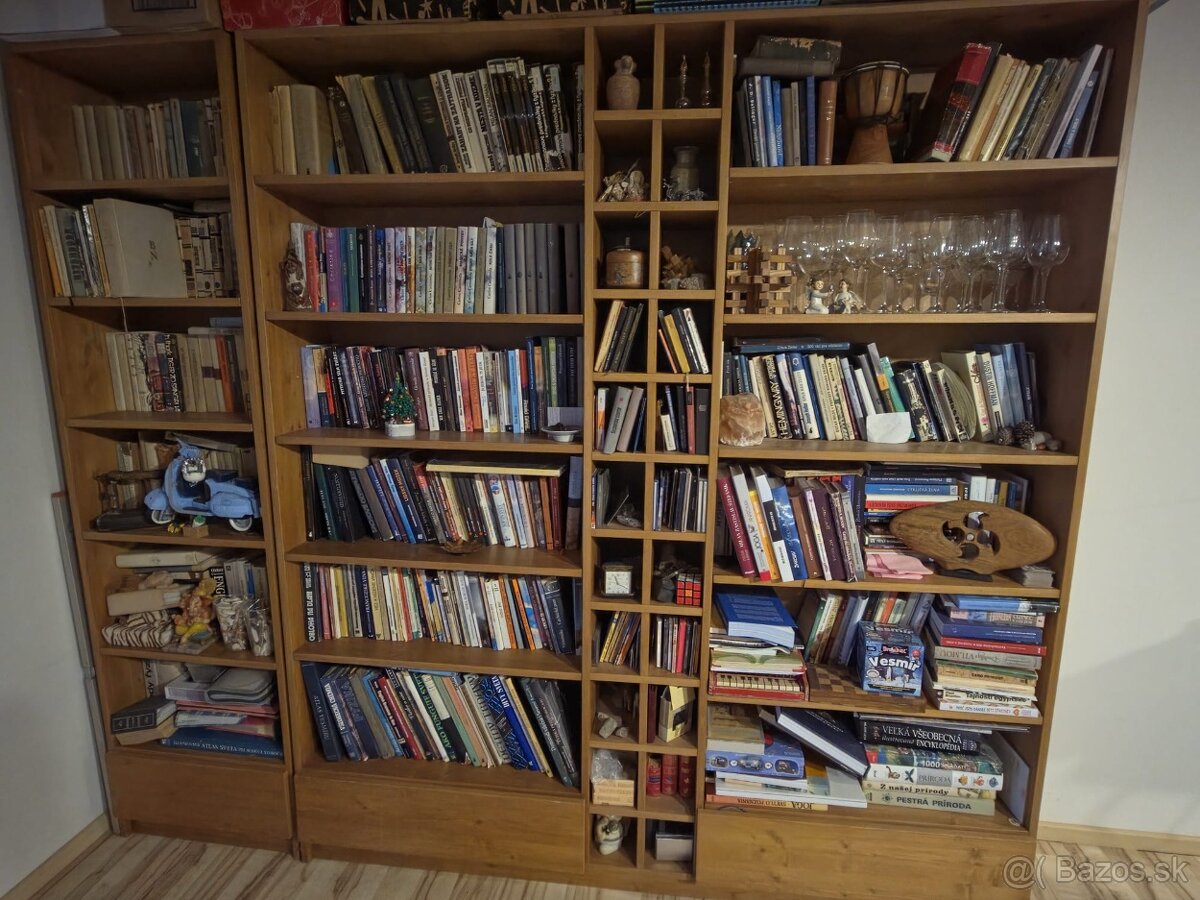 Predám knižnicu (bez knih). Obsahuje dve samostatne časti. V spodnej časti sú šuplíky. Je to masív na zákazku robené, štýl Billy ikea.