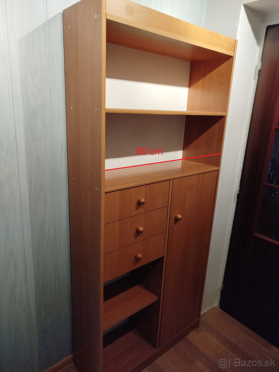 Predám nábytok do detskej izby ako je na obrázkoch. Rozmery sú na obrázkoch. Nábytok nie je nový. Na fotkách sú sfotené aj časti kde je trocha poškodený - na stole a na bočnej strane časti nábytku, kde je rozmer 80 cm /to bolo už pri zakúpení/. Cena je 30 EUR za všetko spolu. Bližšie info meilom alebo na tel. čísle.