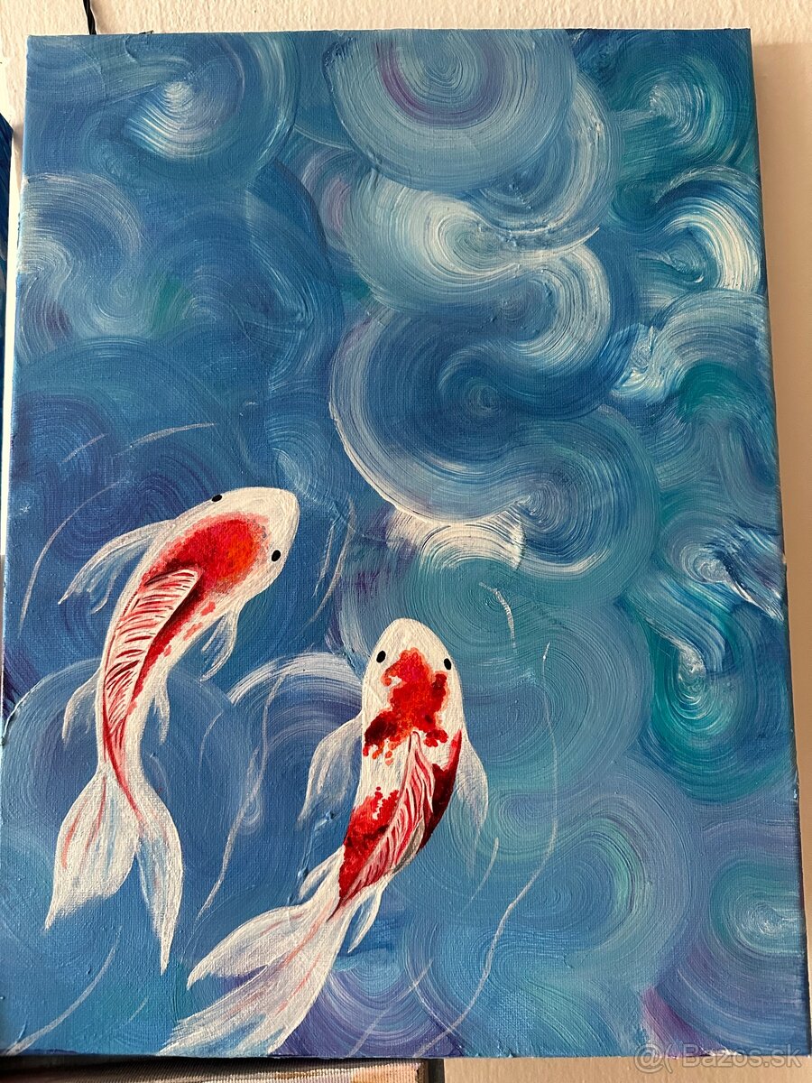 Originálny akrylový obraz zobrazujúci dve ryby koi v pokojnom pohybe vody. Ryby koi sú tradičným symbolom šťastia, hojnosti, vytrvalosti a harmónie. V mnohých kultúrach predstavujú silu, vnútorný pokoj a rovnováhu v živote.